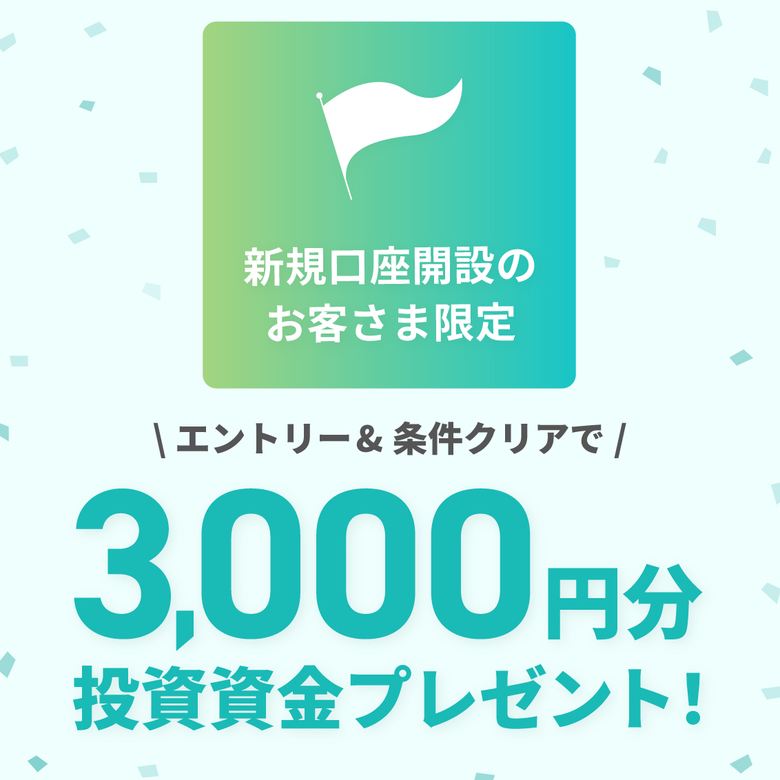 口座開設完了の翌月末までにエントリー&条件を達成された方に3,000円の投資資金をプレゼントいたします。