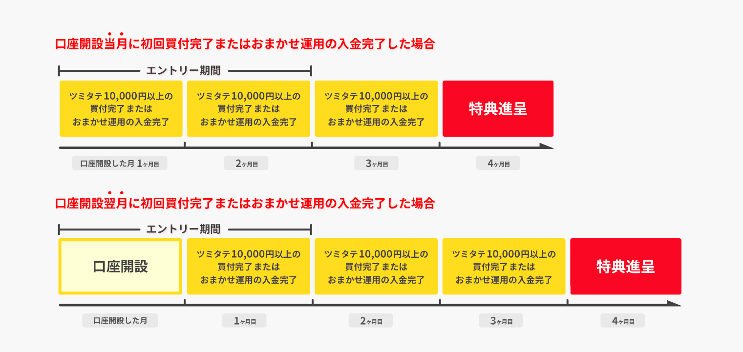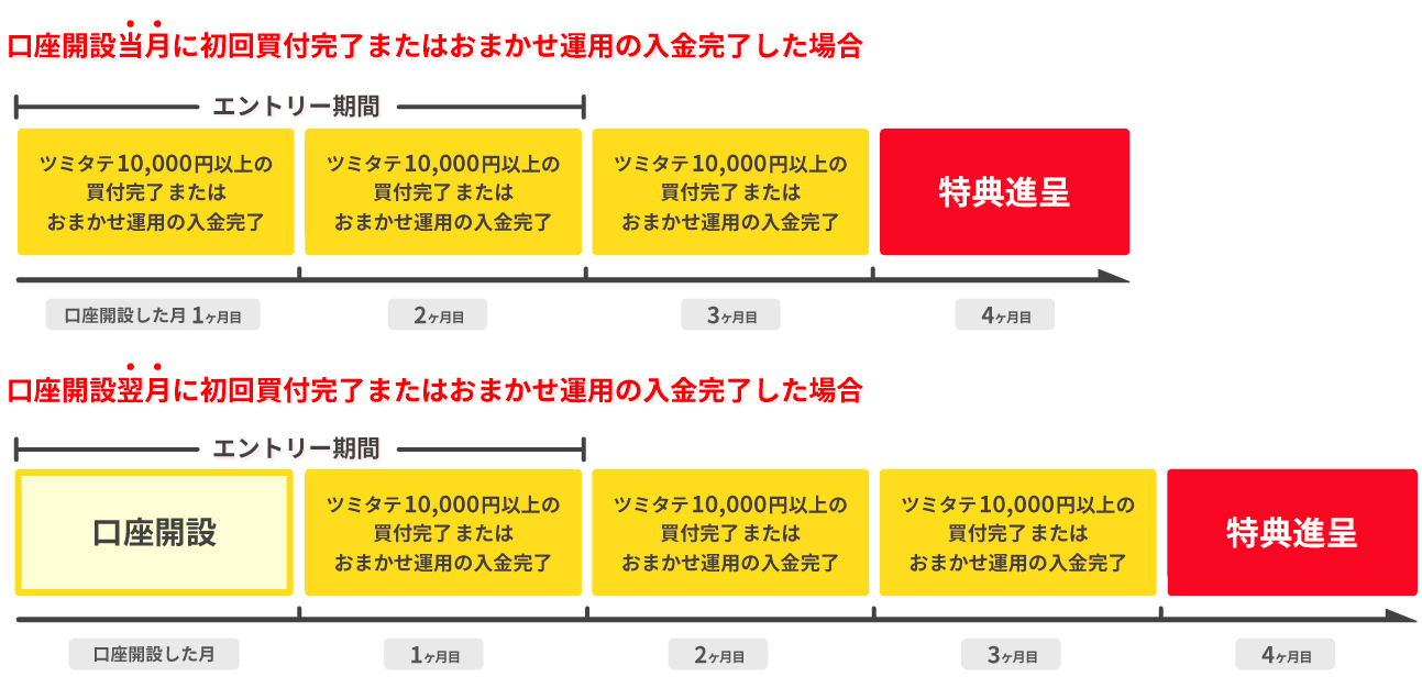 1.新規口座開設日の翌月末までにエントリー 2.新規口座開設完了日の翌月末までの”ツミタテ”による対象取引の初回買付(振替入金含む)が完了し、初回買付より3ヶ月連続で月間合計10,000円以上のツミタテ買付完了 |