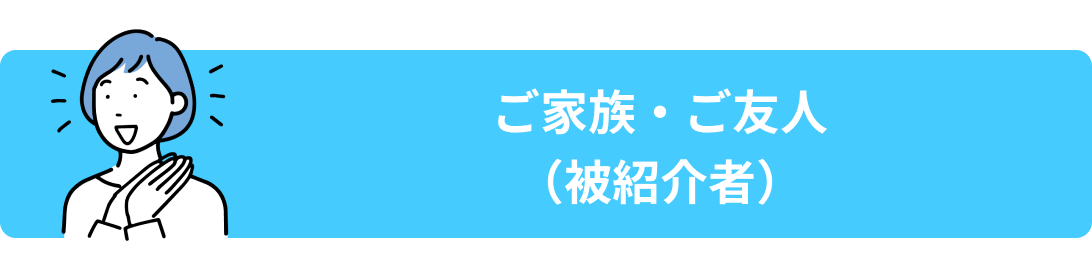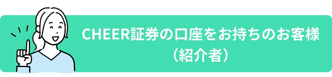 紹介者(ご紹介する方) CHEER証券の口座を開設済みの方 被紹介者(ご家族・ご友人、ご紹介される方) CHEER証券の口座を未開設の方 ※金融商品仲介口座のお客様には紹介コードは発行されません。 ※金融商品仲介口座のお客様が被紹介者の場合、特典は進呈されません。 |