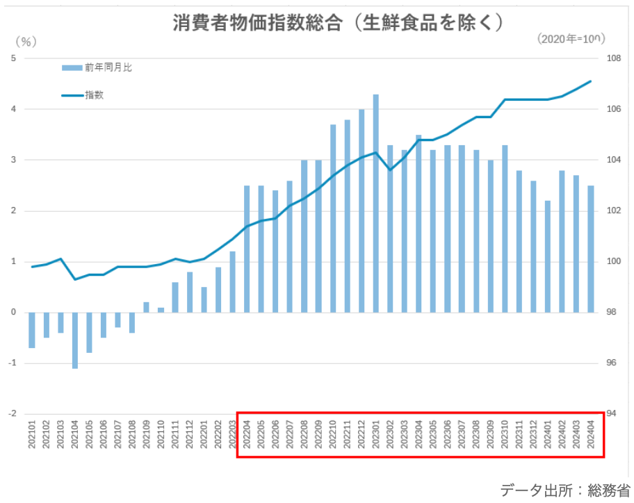 日本で消費者物価(CPI)の上昇が2%を超える水準で推移しているのは、2022年4月以降です。