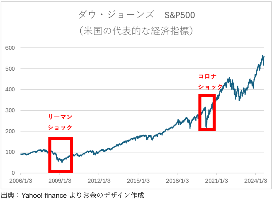 リーマンショックやコロナショックのような世界的な相場の下落があっても、時間をかけて回復しています。