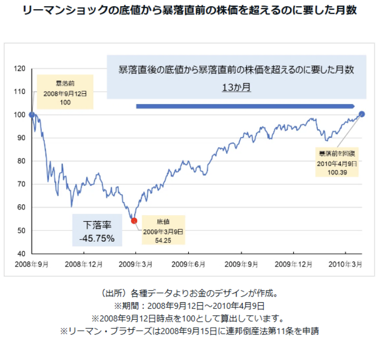 暴落が起こった後、さらに株価の下落が続くことはあり得ますが、過去の例を検証すると、ある期間を経ると暴落前の株価を上回って来るのが一般的です。そして、その回復に要する期間は長期投資家にとっては必ずしも長い期間ではありません。
