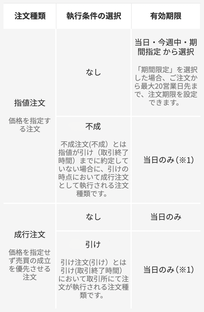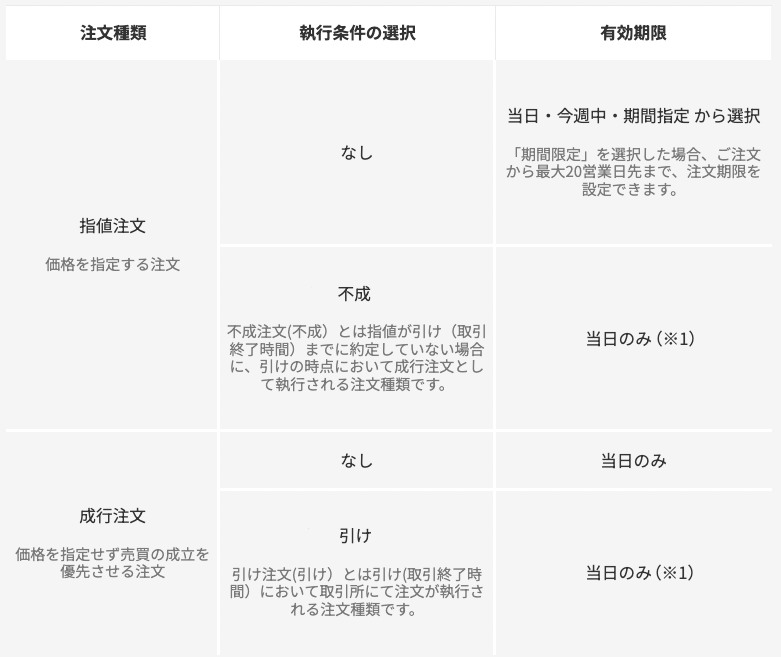 | 注文の種類・執行条件・有効期限 |