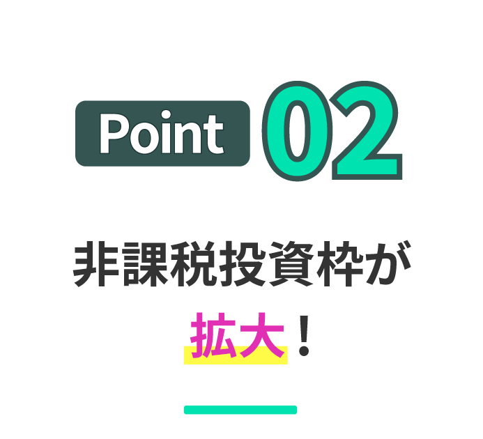 | 非課税保有限度額 | 1,800万円 (うち成長投資枠は1,200万円まで) 売却した場合は、その分の非課税保有限度額(総枠)が翌年以降再利用可能