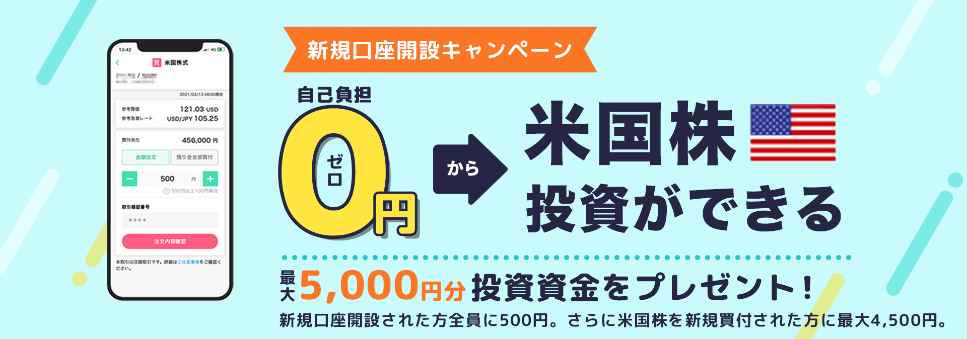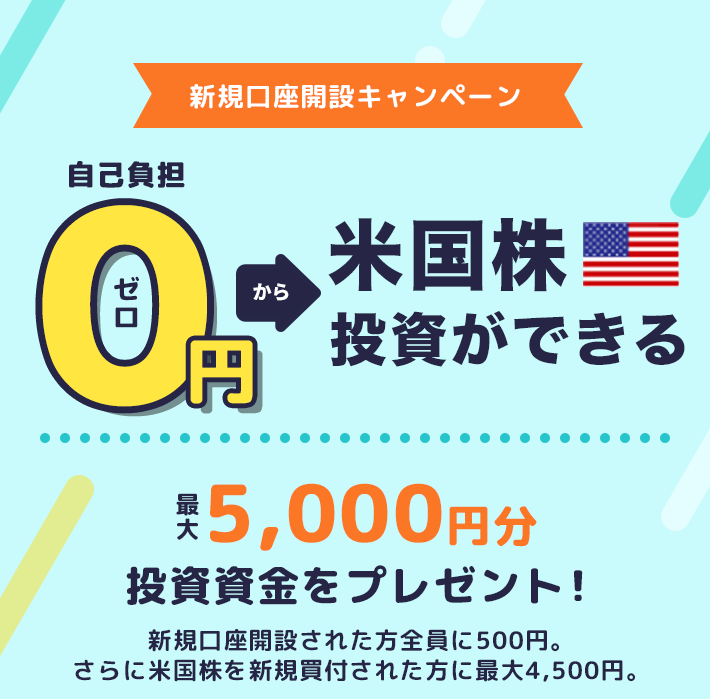 | 内容 | 以下の①②の条件で特典を進呈いたします 特典① 期間内に新規口座開設された方全員に500円分の投資資金 特典② ①の方で 1.合計5,000円以上の米国株の買付取引をされた方全員に、500円分の投資資金(①と合計 1,000円) 2.合計10,000円以上の米国株の買付取引をされた方全員に、1,500円分の投資資金(①と合計 2,000円) 3.合計25,000円以上の米国株の買付取引をされた方全員に、4,500円分の投資資金(①と合計 5,000円) |